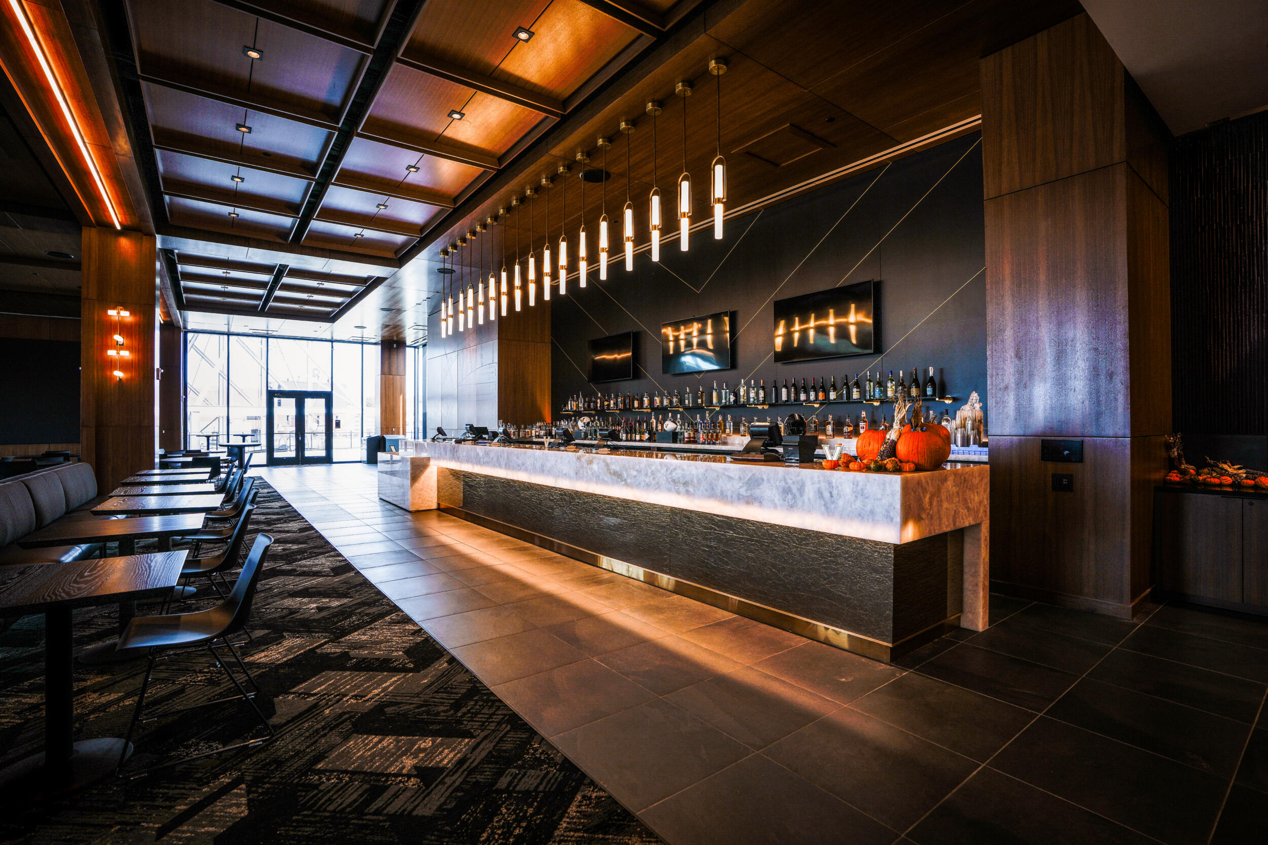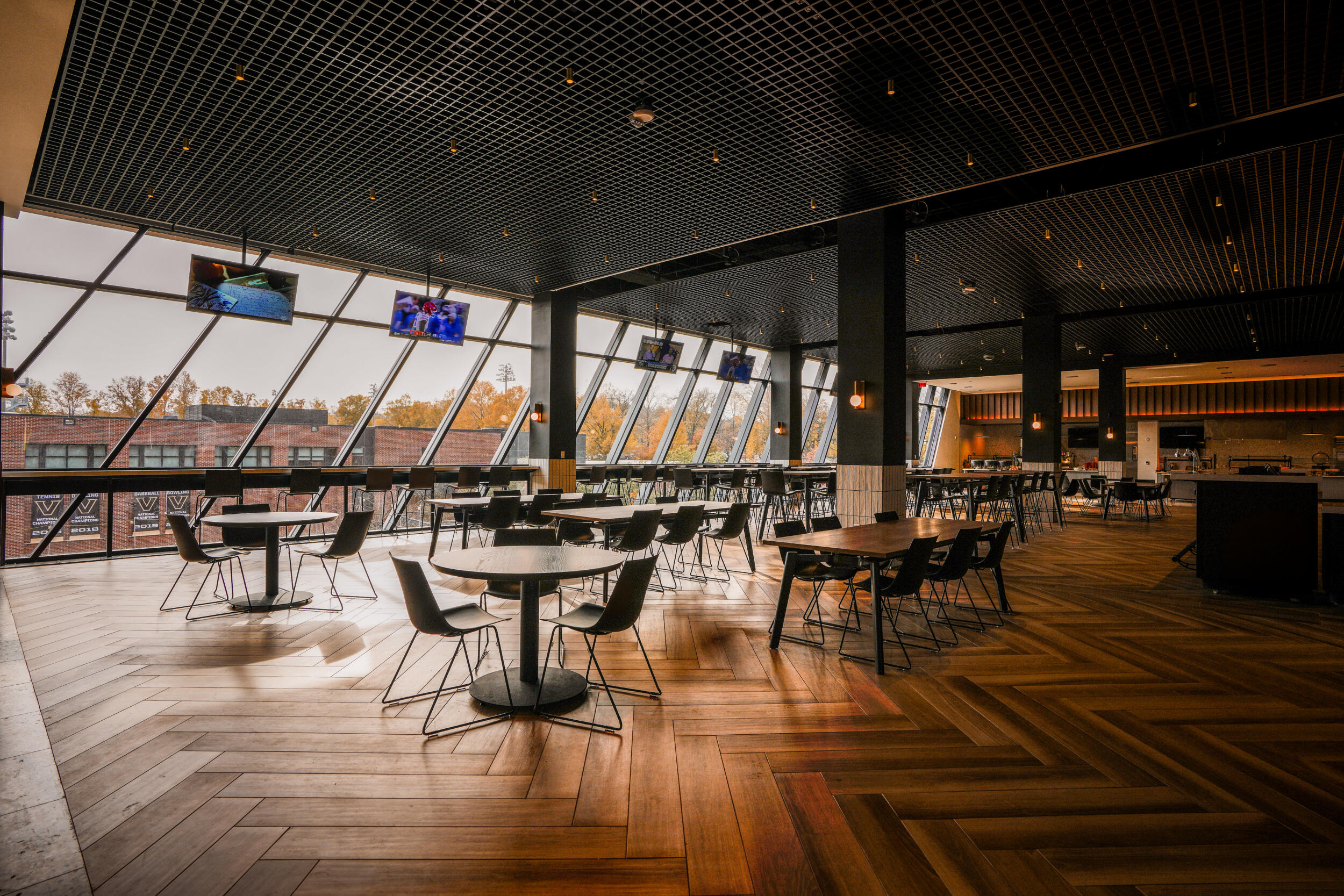 Televisions mounted above the seating outdoors, and inside the hospitality lounge to allow guests to keep up with all of the action around the country