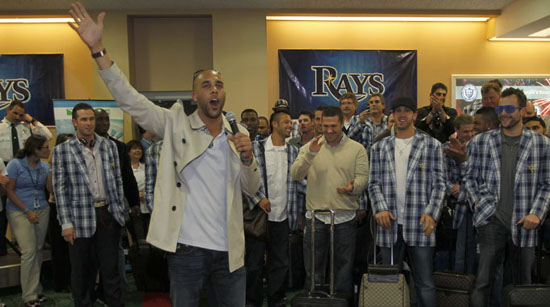 David Price addresses Tampa Bay fans at the St. Petersburg Airport after the Rays returned as AL East champions with a 3-2 win over Kansas City. (Photo Credit: Skip Milos, MLB.com)