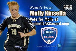 - Soccer’s Molly Kinsella is one of 10 finalists for the Lowes Senior CLASS Award. It’s a national honor that will be determined by a combination of on-line fan voting along with media and coaching input. Molly is a molecular and cellular biology major who has made our Dean’s List every semester; she has led the soccer team in scoring three years and has been active in community service. She currently leads fan voting and needs your help; you can vote once per day through November 14 by clicking here. Voting requires just a matter of seconds.