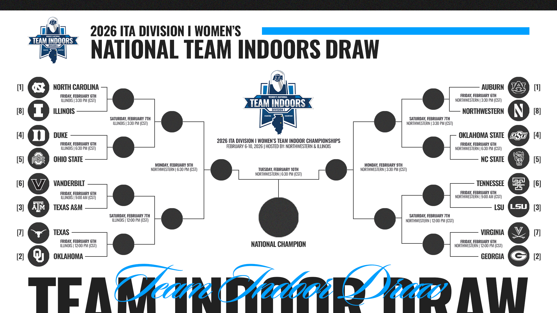 NASHVILLE, Tenn. — Matchups and times have been released for the ITA National Team Indoor Championship, with No. 12 Vanderbilt beginning its tournament in an SEC matchup as the Dores face No. 2 Texas A&M on Friday.