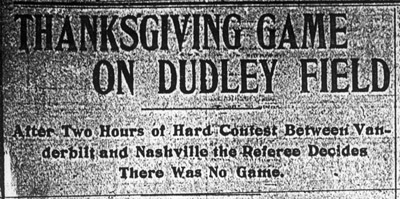 Thanksgiving Day 1899 on Vanderbilt’s Dudley Field ended in controversy and the results might be in doubt in 2009. The Vanderbilt Law School presently stands on the original site of Dudley Field. The contentious game involved cross-town University of Nashville (Peabody).