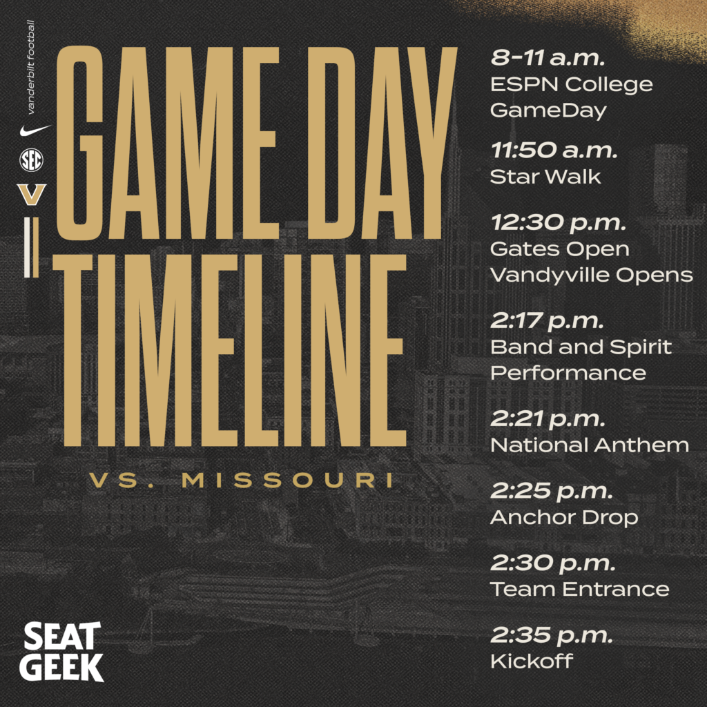 No. 10/12 Vanderbilt returns to FirstBank Stadium on Saturday to play host to No. 15/14 Missouri in an SEC matchup airing on ESPN, 102.5 The Game and 94.9 The Fan. Whether you’re cheering on the black and gold from the stands or from home, VUCommodores.com will have all the information you’ll need throughout the afternoon.